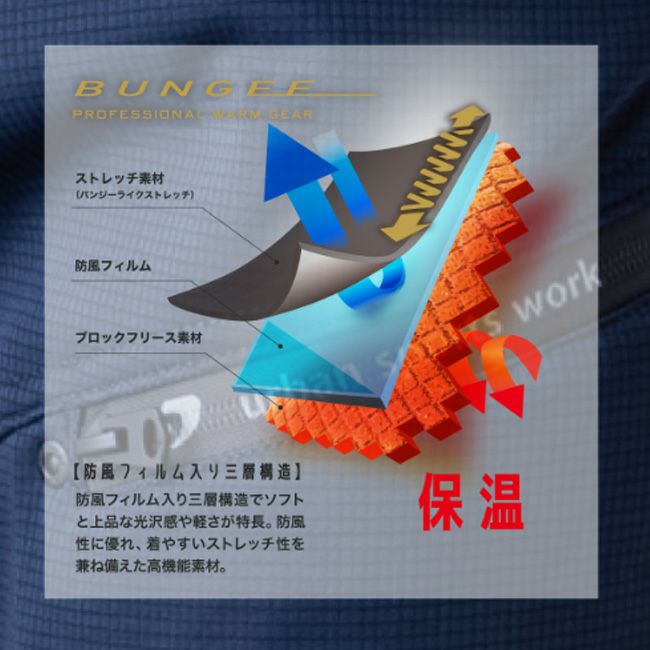 特徴 バンジーライクストレッチ、防風、ブロックフリース