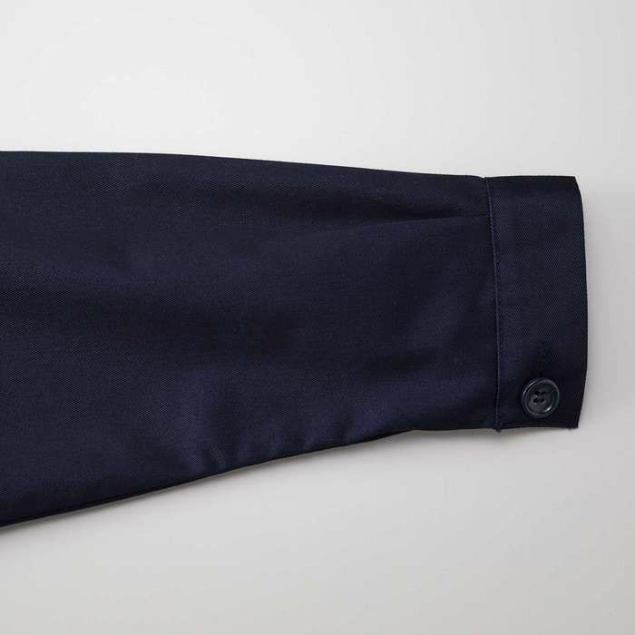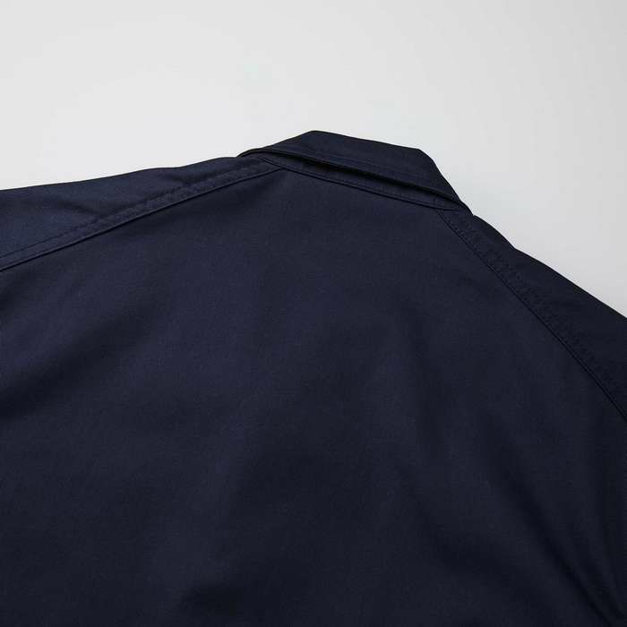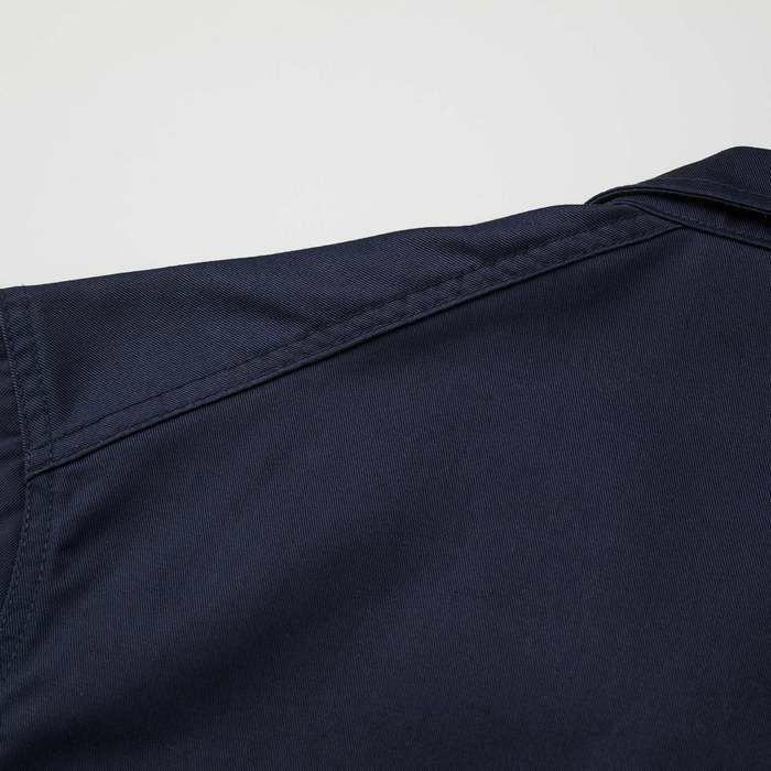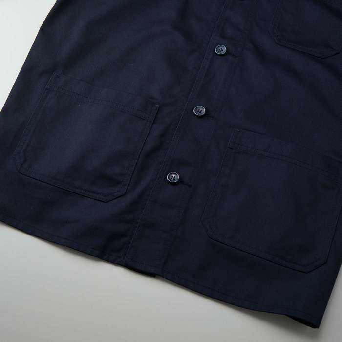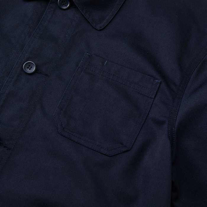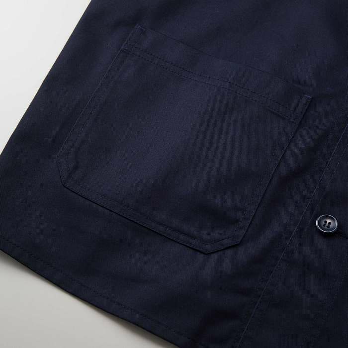 ワークディテールのあるペン差し付きの胸ポケットとカフスボタンが内側仕様の機能的なカバーオール