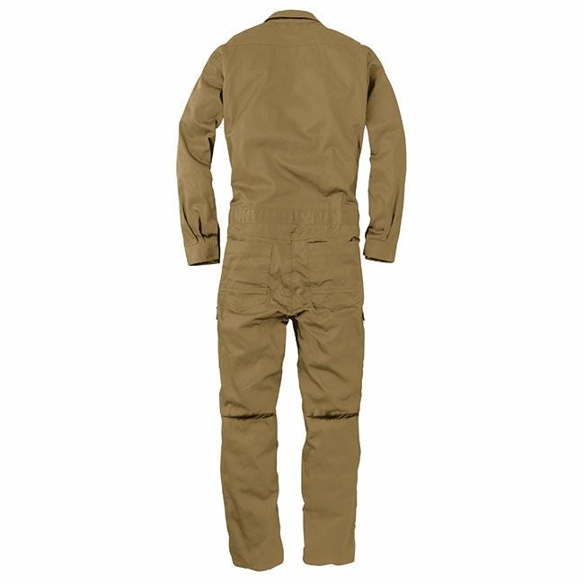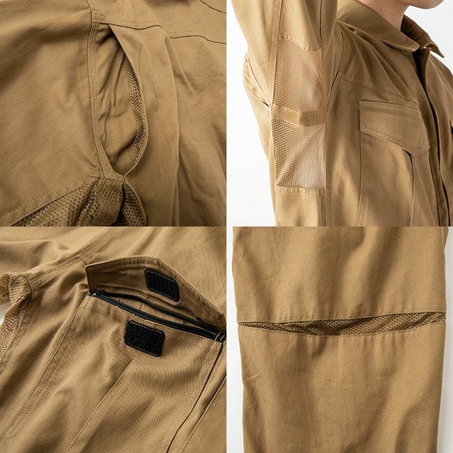 薄手のコットンツイル生地をベースに、部分的にメッシュ生地も用いて通気性を確保。作業性を損なわないよう脇下立体裁断と背中のアクションプリーツを搭載し、膝の3Dカットに開脚がスムーズなクライミングカット仕様。収納面でも抜かりはなく、太腿部分にはマチ付きのカーゴポケットを設け、両胸のポケットにはファスナーも備えたプロスペックモデル。全てが一つに詰まったまさにオールインワンな仕様。過酷なワークシーンに耐えうる本格派のツナギです。