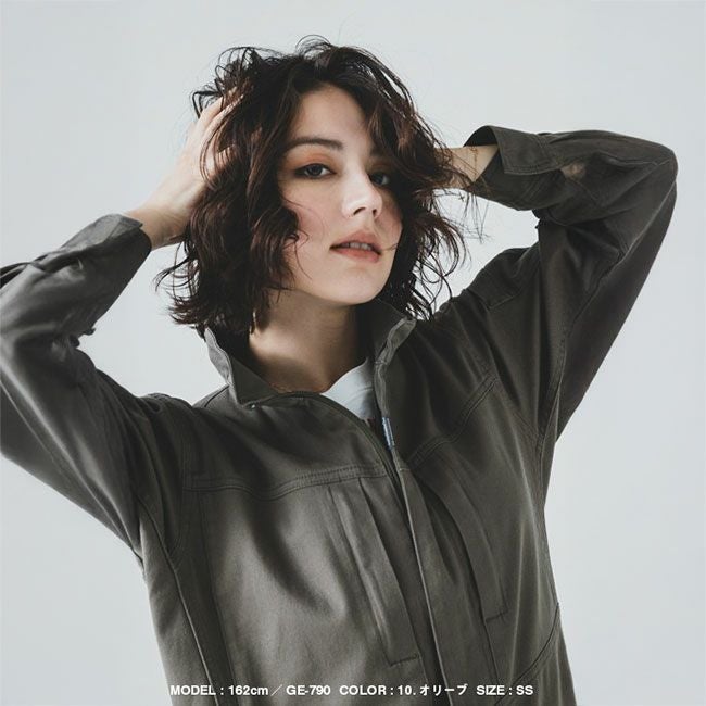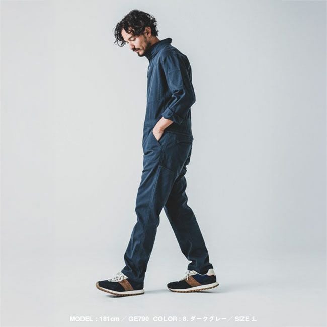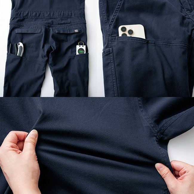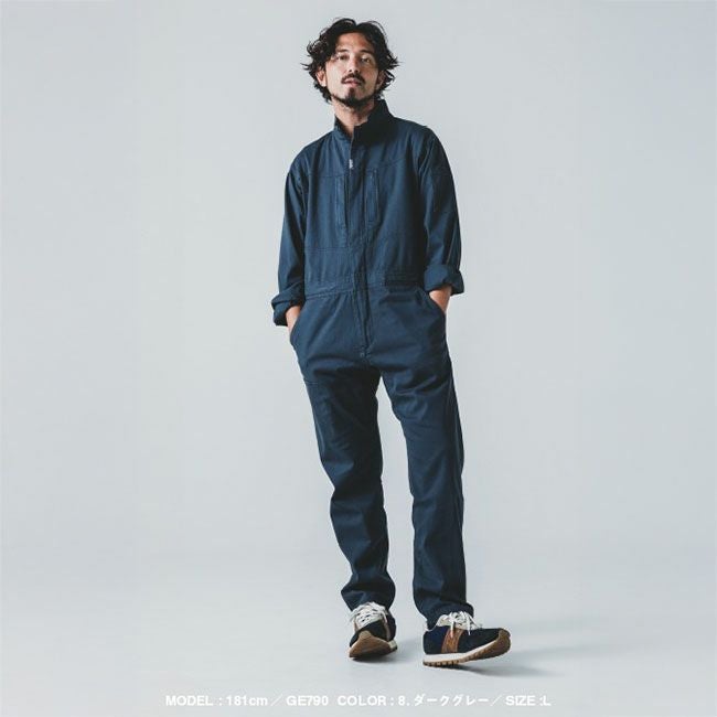 カジュアルなデザインも良いけど、ベーシックでユニフォームとしても揃えられるデザインで、便利なヒップオープンファスナー付きツナギを!というご要望から満を持してリリース。 長きにわたり支持が多いコットン素材に今の時代の定番機能であるストレッチ性もしっかりある中厚の生地ですので、ハードなワークシーンにもピッタリなツナギです。