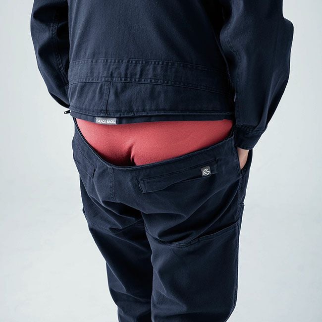 ツナギやサロペットの最大のネガティブポイントであった、お手洗い時の問題がクリアになったストレスフリーな便利機能。腰周りのファスナーで簡単に開閉が出来てヒップオープンになるので、上着部分を脱がずに用が足せます。まだお試しでない方は是非ともお試しください!『GRACE BACK(R)』の虜になる事間違いありません。