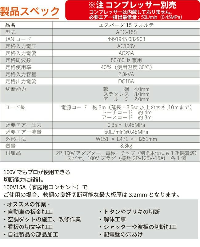 他の画像を見る 本格 100V マシン で 最高 の キリ ・ ヌキ を ! SUZUKID 【APC-15S】 100V 専用 エアープラズマ 切断機 エスパーダ 15 フォルテ 定価 ¥ 169,730 販売価格 ¥ 99,800 税込 カートに入れる お気に入りに登録する