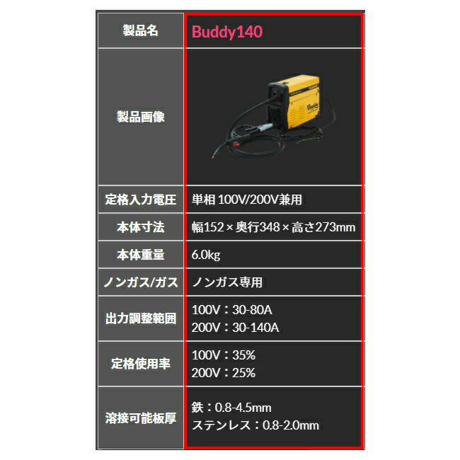 他の画像を見る プロ も 納得 する 200V にも 対応 した ハイスペック 上位 モデル SUZUKID Buddy140【SBD-140】 100V 200V 兼用 インバータノンガス 半自動溶接機 Buddy 140 定価 ¥ 74,250 販売価格 ¥ 49,186 税込 カートに入れる お気に入りに登録する