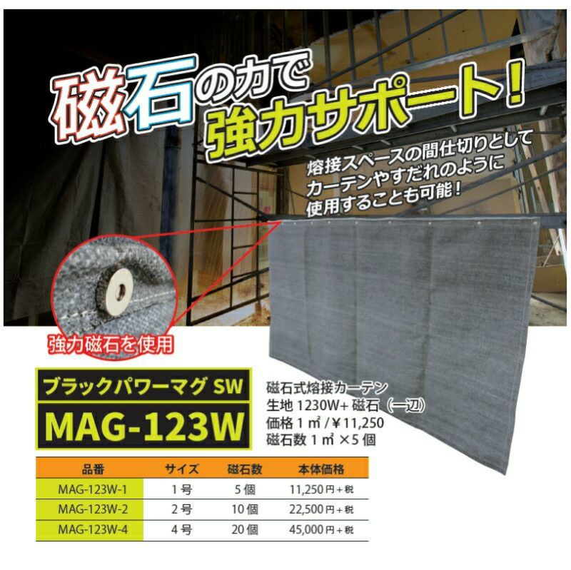 他の画像を見る 磁石の力で壁面に貼れる!現場から生まれたアイデア商品。溶接スペースの間仕切りのようにも使える! 【 送料無料 】 磁石付き溶接カーテン MAG-123W-1 (サイズ1号(920×920mm) 定価 ¥ 14,245 販売価格 ¥ 9,733 税込 カートに入れる お気に入りに登録する