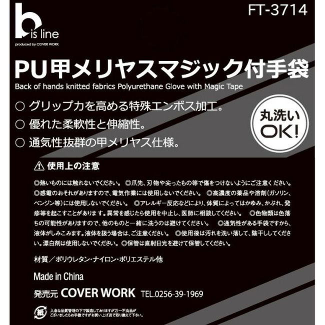 CUC COVER WORK PU 甲メリヤス マジック付 手袋 FT-3714 【cw0851】【cw0852】【cw0853】 | bisline グローブ 作業 作業用 現場 柔軟性 伸縮性 グリップ力 エンボス加工 通気性 甲メリヤス仕様 黒 レッド デジカモ