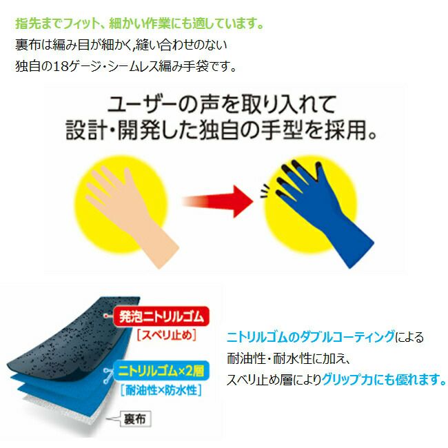 他の画像を見る 使い始め から 手に なじむ 柔らかさ を 実現 。 ショーワグローブ 【ニトローブ W+】 ポリエステル ニトリル ゴム 手袋 1双 販売価格 ¥ 597 税込 カートに入れる お気に入りに登録する
