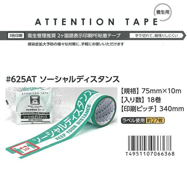 他の画像を見る 衛生 管理 推奨 2か国語 表示 印刷 PE 粘着 テープ アテンションテープ 625AT 【ソーシャルディスタンス】 75mm×10m 18巻入り 養生 販売価格 ¥ 16,500 税込 カートに入れる お気に入りに登録する