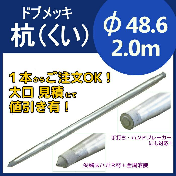 他の画像を見る サビにくい溶融亜鉛メッキ(ドブメッキ)仕様。先端はハガネ材のため難地盤にも施工可。手打ち、ハンドブレーカーにも対応。太陽光架台、小屋、柵、仮設などの基礎や支柱に。 【直送限定・代引き不可】ドブメッキ鉄製くい(杭)48.6φ1.5m 販売価格 ¥ 3,370 税込 在庫切れ 再入荷お知らせ お気に入りに登録する