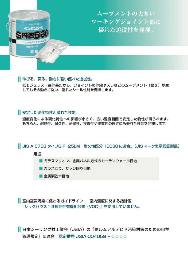 他の画像を見る シリコーン系 シックハウス用/1成分形ハイバリアタイプ 【330mm 10本セット】ペンギンシール SR2512 シックハウス対応 室内専用 シーリング 1成分形 変成シリコーン 販売価格 ¥ 11,191 税込 詳細を見る お気に入りに登録する