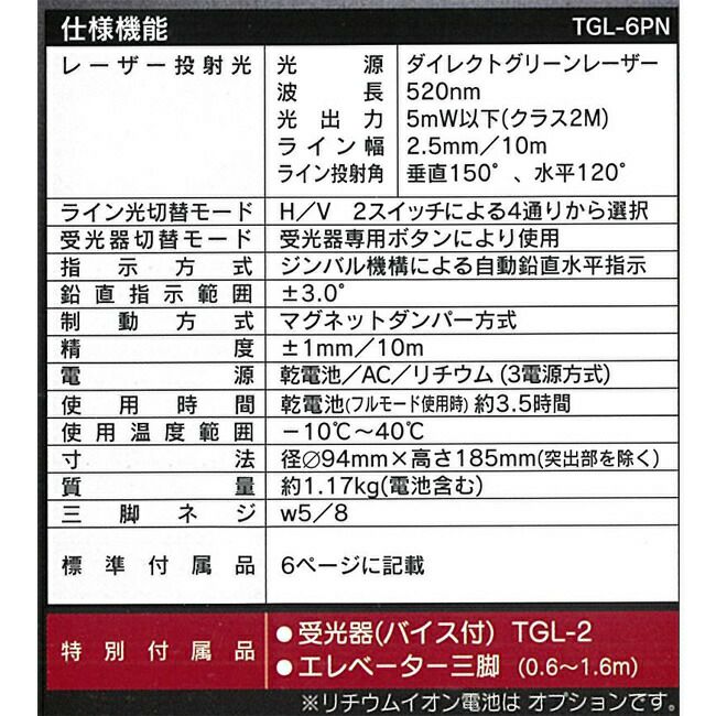 プロ の 現場 で 活躍 する TGL シリーズ 盗難 火災 補償 付き グリーンレーザー 墨出し器 TGL-6PN