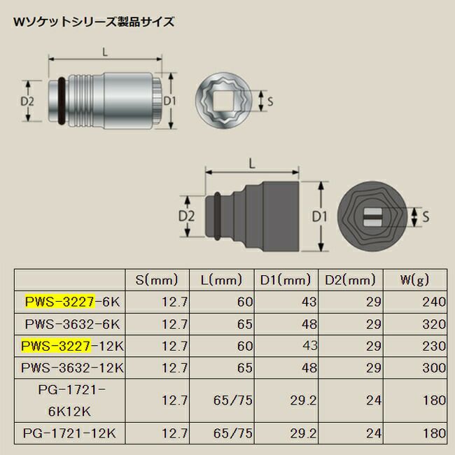椿モデル_仮締用Wソケット PWS-3227 32x27mm 12.7mm 6角 12角 6K 12K