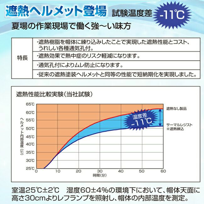 他の画像を見る 特殊遮熱塗装によりヘルメット内の温度が無塗装製品に比べ-8℃ 【熱中症対策】ヘルメット(KKC-BNクール) 【住ベテクノプラスチック】 販売価格 ¥ 5,107 税込 在庫切れ 再入荷お知らせ お気に入りに登録する