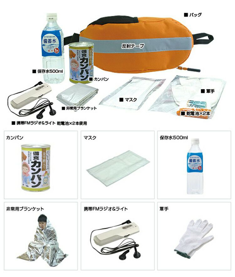 セット内容/バッグ、保存水500ml、カンパン、非常用ブランケット、軍手、携帯FMラジオ&LEDライト(乾電池2本付き)、マスク