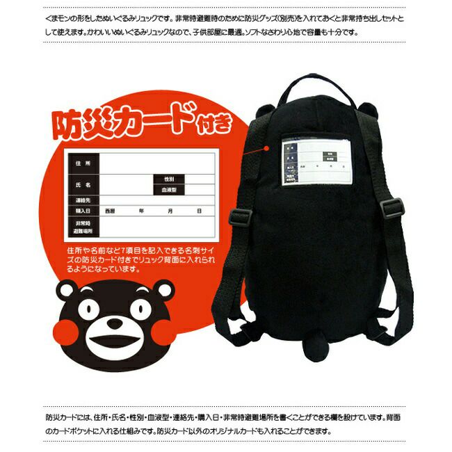 くまモンの形をしたぬいぐるみリュックです。非常時避難時のために防災グッズ(別売)を入れておくと非常持ち出しセットとして使えます。