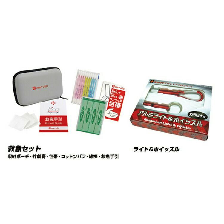 セット内容/リュック、防災カード、救急セット(収納ポーチ・絆創膏・包帯・コットンパフ・綿棒・救急手引)、非常用ブランケット、子供用のびる手袋、ライト&ホイッスル(電池別売)、抗菌非常用トイレ(銀配合凝固消臭剤×1個、汚物袋×1枚)
