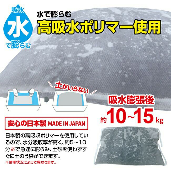 素材 土のう袋:不織布、紐:ポリエステル、凝固剤:吸水ポリマー(※給水するのは水のみで、海水は吸水しません。)