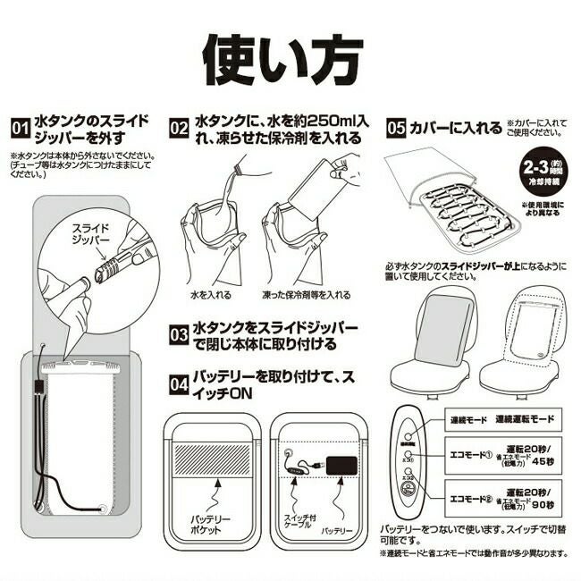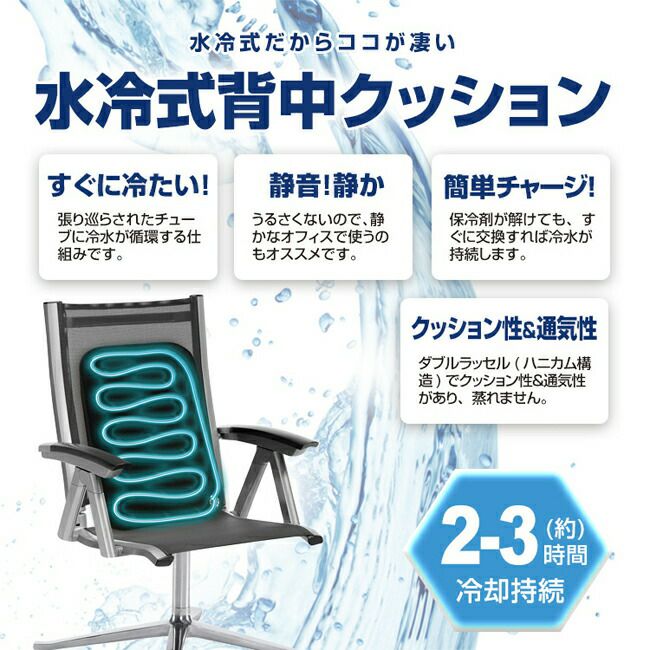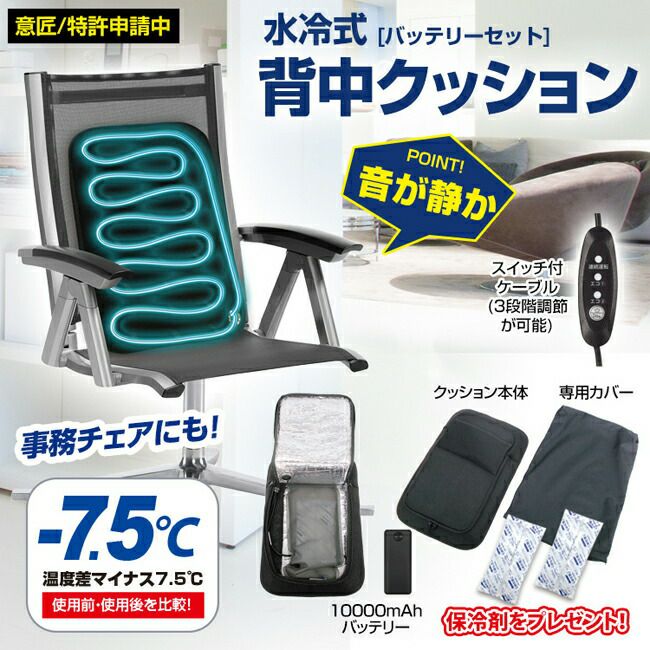 ●セット内容:水冷式背中クッション本体(専用カバー付)、10000mAhモバイルバッテリー(出力/USB-A/5V)、スイッチケーブル、[プレゼント]保冷剤500g×2個