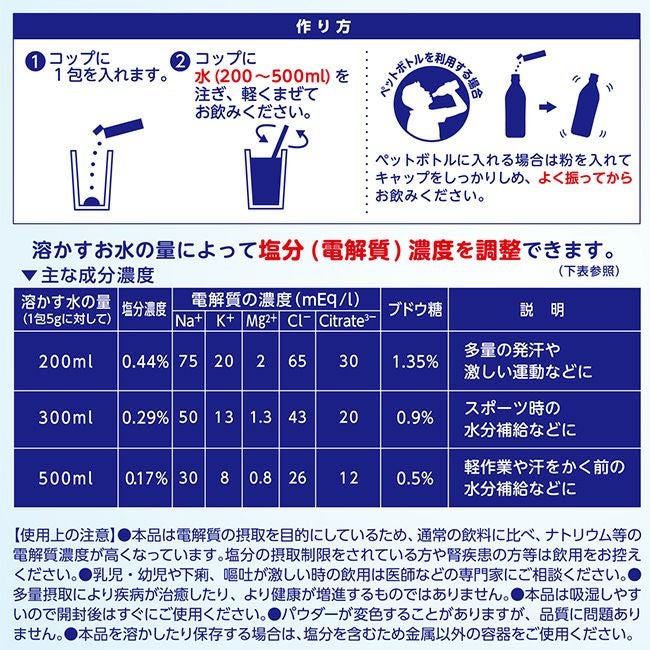 成分(1包あたり):エネルギー 14.5kcal、食塩相当量 0.9g、カリウム 157.3mg、マグネシウム 4.8mg、カルシウム 9.6mg、その他(ブドウ糖、海塩など)