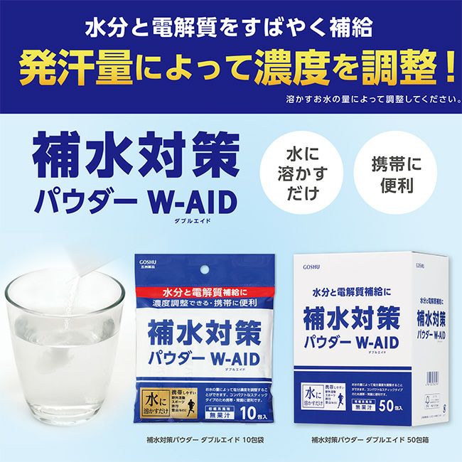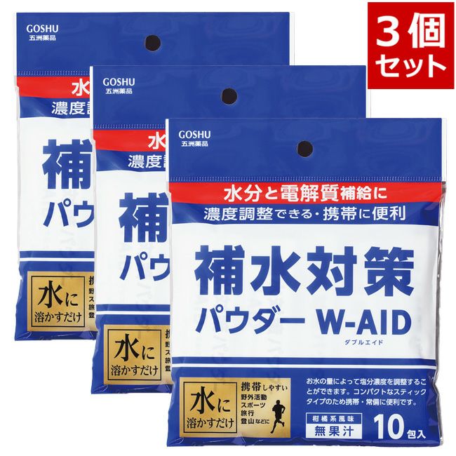 五洲薬品の「補水対策パウダー ダブルエイド 10包」は、1本タイプの粉末清涼飲料で、水に溶かすだけで水分と電解質を効率よく補給できます。