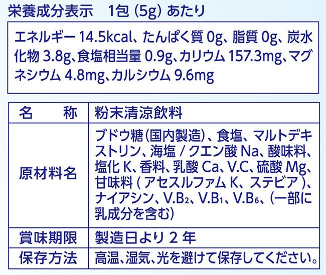成分(1包あたり):エネルギー 14.5kcal、食塩相当量 0.9g、カリウム 157.3mg、マグネシウム 4.8mg、カルシウム 9.6mg、その他(ブドウ糖、海塩など)