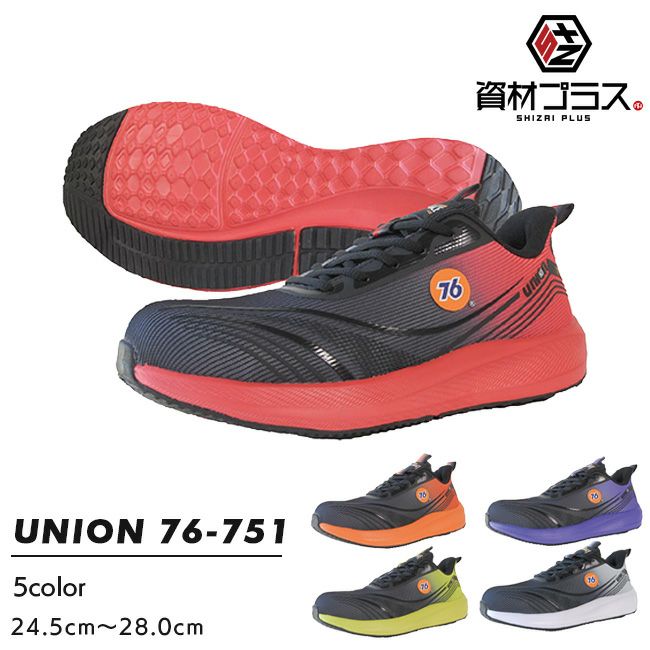 UNION 76-751 セーフティシューズは、鋼製先芯入りでつま先をしっかり保護し、工場・倉庫・建設現場など 幅広い作業シーンで安心して使える設計 になっています。