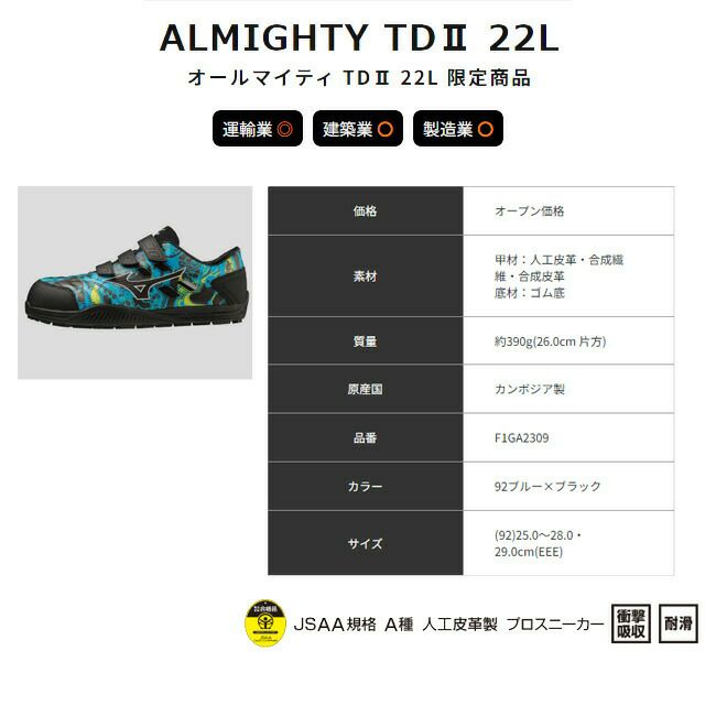 他の画像を見る 2023 2023年 限定 数量限定 限定カラー 限定モデル ミズノ mizuno 安全靴 作業靴 ALMIGHTY TD2 11L 22L 【F1GA2315】【F1GA2314】 販売価格 ¥ 11,880 税込 在庫切れ カートに入れる お気に入りに登録する