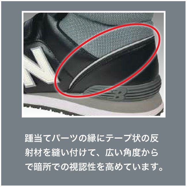 ・踵当てパーツの縁にテープ状の反射材を縫い付けて、広い角度からで暗所での視認性を高めています。