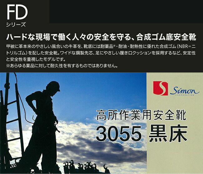 安心のJIS製品!フラットソールの高所作業用安全靴 シモン安全靴 高所作業用 3055黒床