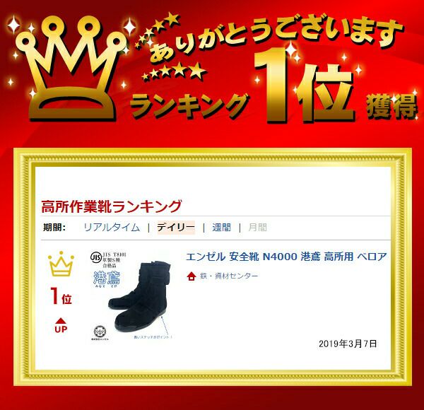 他の画像を見る 【JIS T8101革製S種合格品】青いステッチが特徴のオリジナル商品。高所作業に。 エンゼル 安全靴 N4000 港鳶 高所用 ベロア 販売価格 ¥ 9,815 税込 カートに入れる お気に入りに登録する