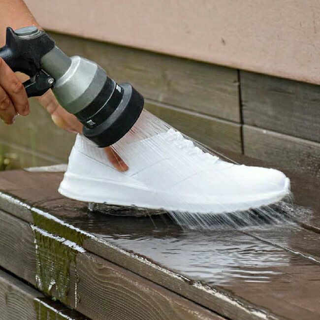 ランランRAINは水だけでも汚れが落とせるので、お手入れが簡単。洗剤を使わない、環境にもやさしいシューズです。