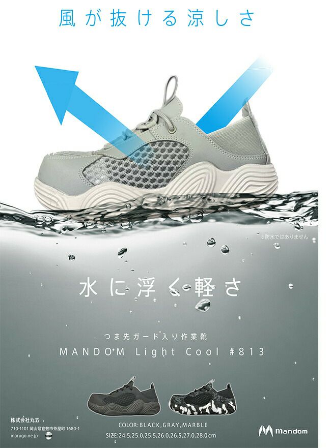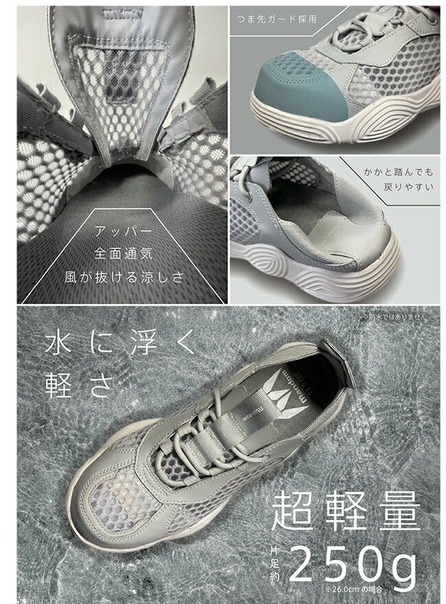 特徴 ●丸五史上もっとも軽い先芯入りワークシューズ。アッパーに通気性の良いメッシュ、ソールに軽さとクッション性を兼ね備えたEVAを使用することで業界最軽量クラスの軽さを実現しました。●かかとを踏んでサンダルのようにも履ける2WAY仕様。●足の快適さをとことん追求したワークシューズです。