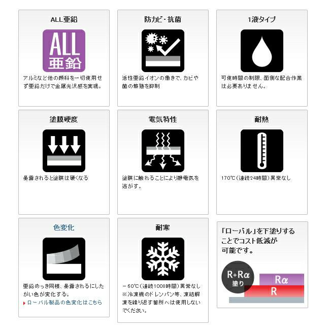 他の画像を見る さび止め効果に「防カビ」「抗菌」をプラス ALL亜鉛でソリッドな金属感のある仕上がり ローバルアルファ ( 20kg 缶 ) 販売価格 ¥ 76,280 税込 カートに入れる お気に入りに登録する