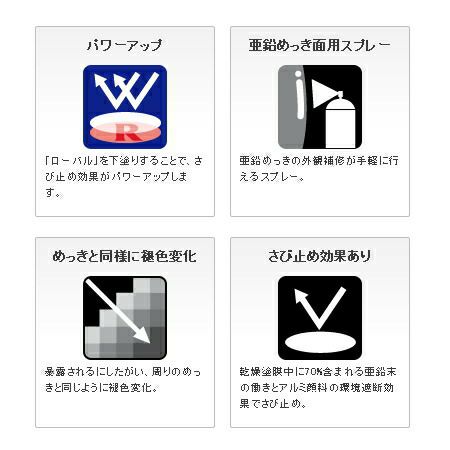 他の画像を見る 常温で場所を問わずに施工できる「塗る亜鉛めっき」亜鉛めっきのさび止め効果を塗装で実現 ローバルスプレー ( 300ml ) 販売価格 ¥ 1,780 税込 カートに入れる お気に入りに登録する