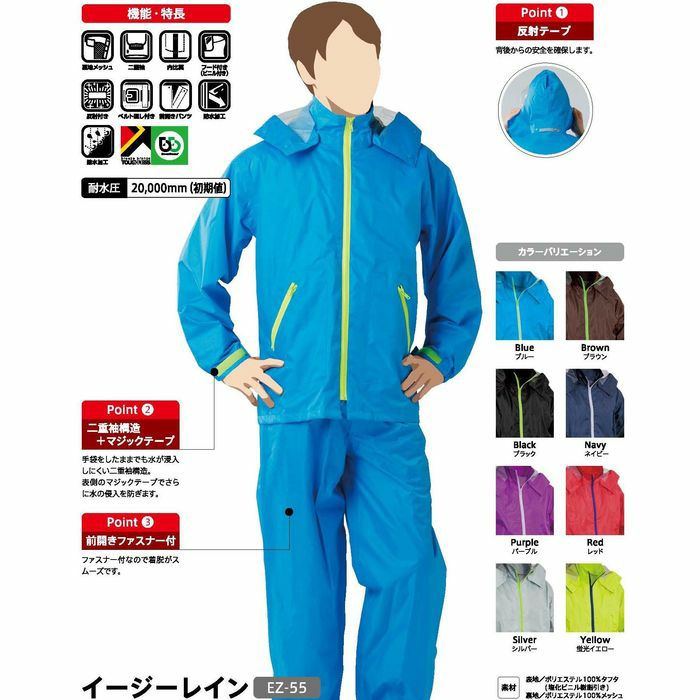 他の画像を見る カラフルな8色展開。臭いを分解する消臭繊維「ブリーズブロンズ」使用。 【 耐水圧20000mm 】 レインウエア コヤナギ イージーレイン 【 EZ-55 】 販売価格 ¥ 5,564 税込 カートに入れる お気に入りに登録する