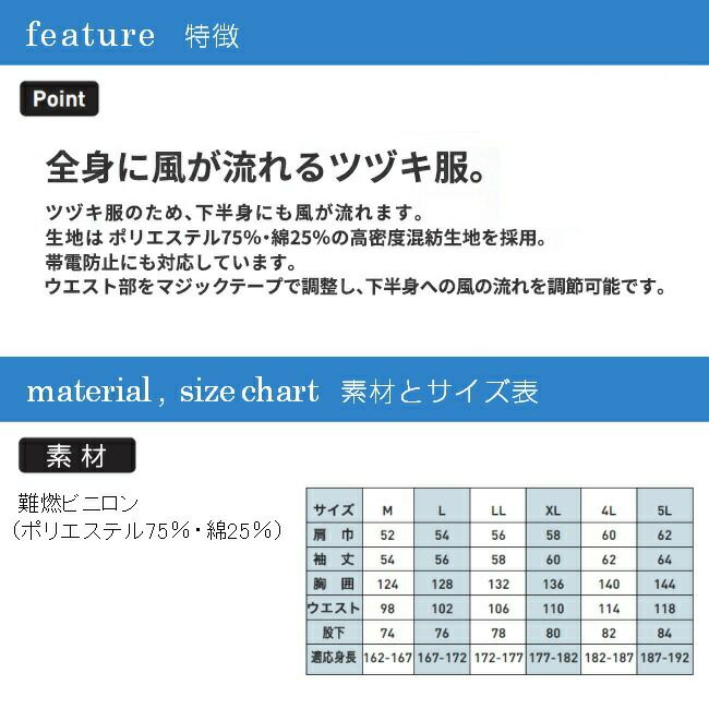 他の画像を見る 全身に風が流れるツヅキ服。帯電防止機能付き。 【空調服(R)】綿・ポリ混紡長袖ツヅキ服(服のみ単品)品番1-9820 販売価格 ¥ 13,934 税込 カートに入れる お気に入りに登録する