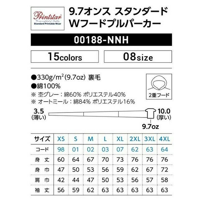 他の画像を見る 大きめ2重フードでほどよい厚みの新定番パーカー 9.7オンス スタンダード Wフード プルパーカー Printstar プリントスター 00188 販売価格 ¥ 3,159 税込 〜 販売価格 ¥ 税込 詳細を見る お気に入りに登録する