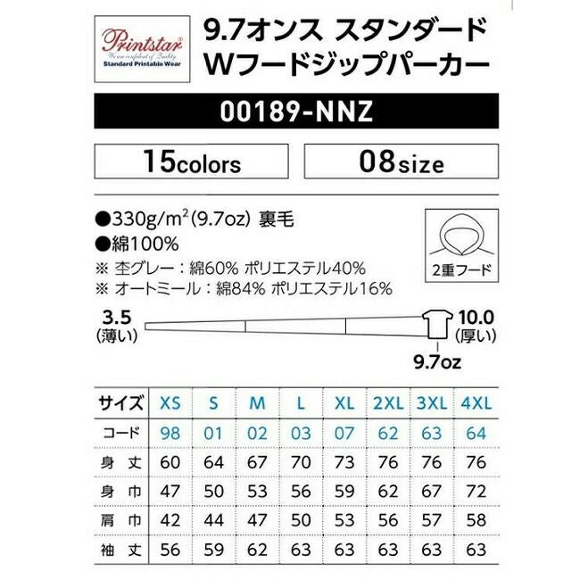他の画像を見る カラー&サイズが大充実の新定番ジップパーカー大きめ2重フードがうれしい 9.7オンス スタンダード Wフード ジップパーカー Printstar プリントスター 00189 販売価格 ¥ 3,545 税込 〜 販売価格 ¥ 税込 詳細を見る お気に入りに登録する